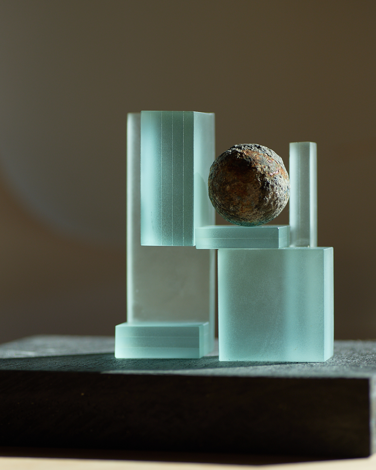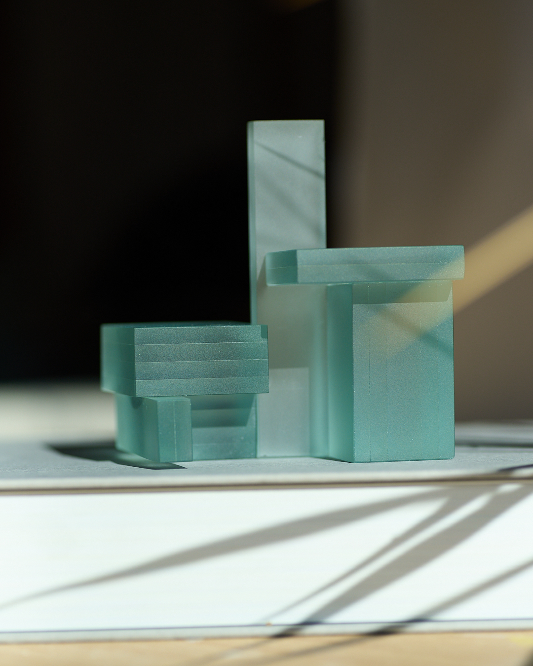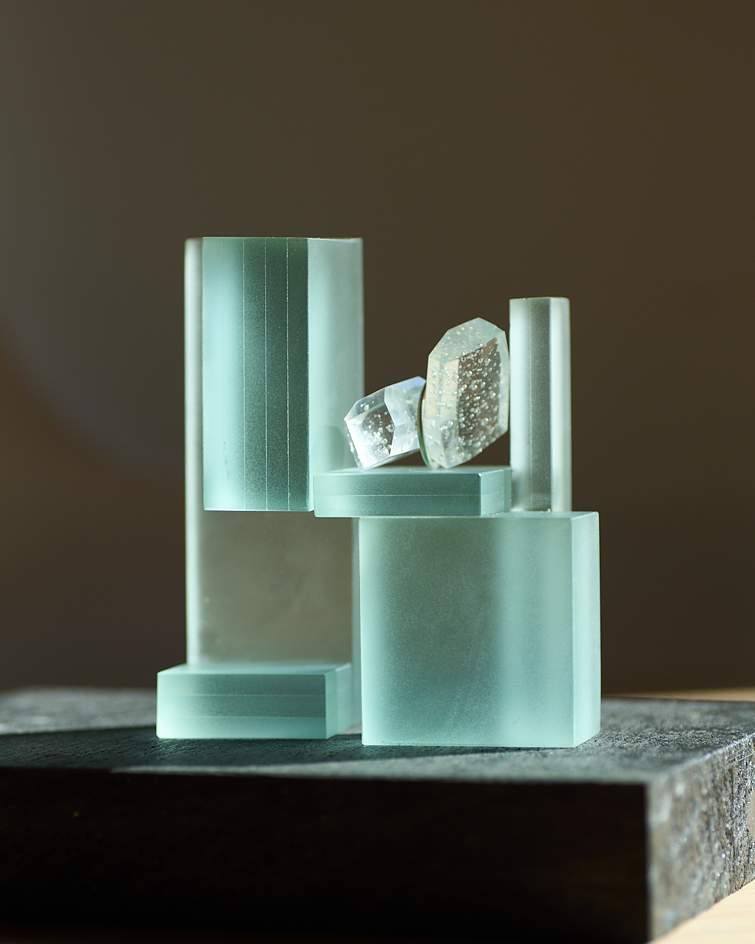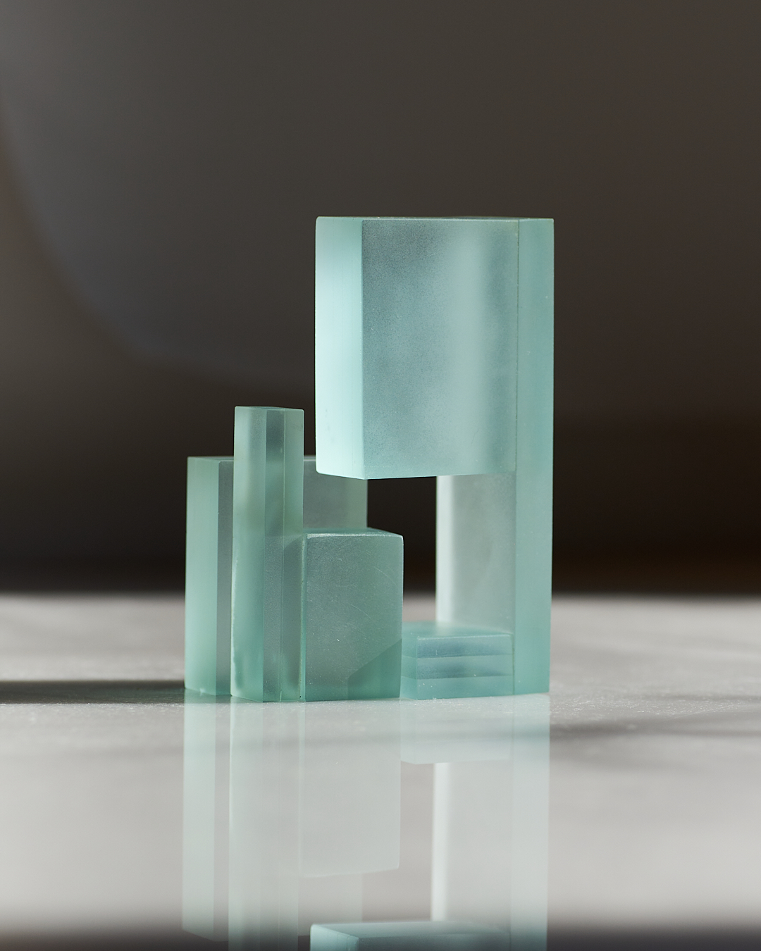 ライトは落水荘の設計において、「外の世界を家の中に引き入れ、家の内を外に導く」という考えを大切にしていたと言われています。そこから私たちは、内と外をつなぐ構成要素しての窓ガラスという境目を手がかりにしました。本来、透明で平らな素材として建築や日用品に使われてきたフロートガラスに、マットなカットと研磨を重ねることで、WRIGHT はうまれました。