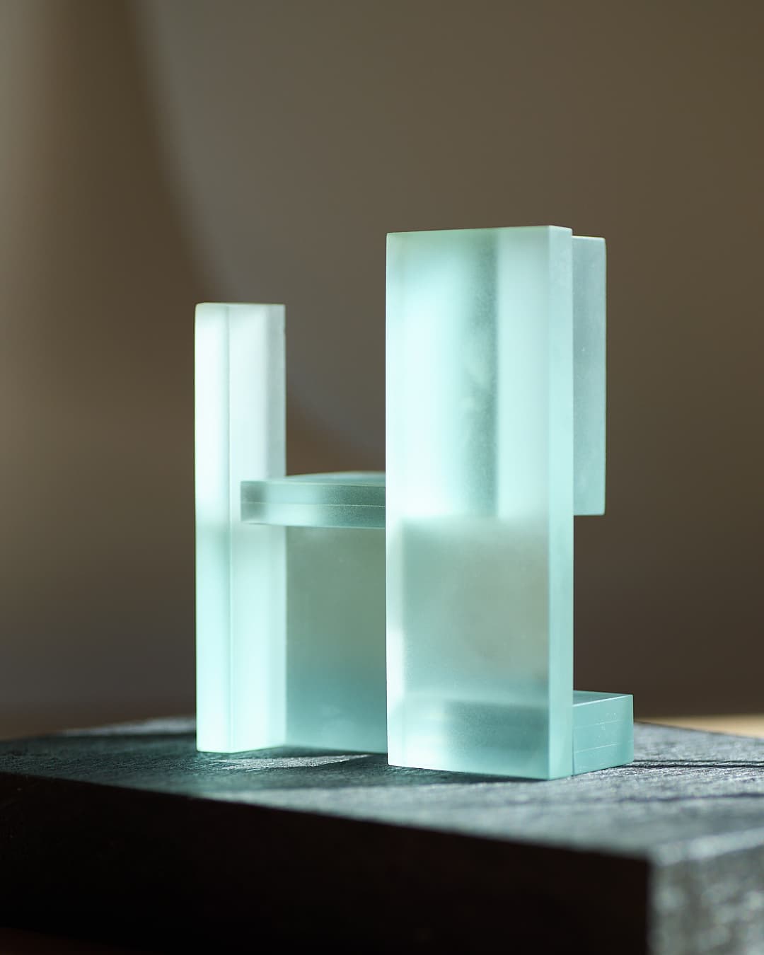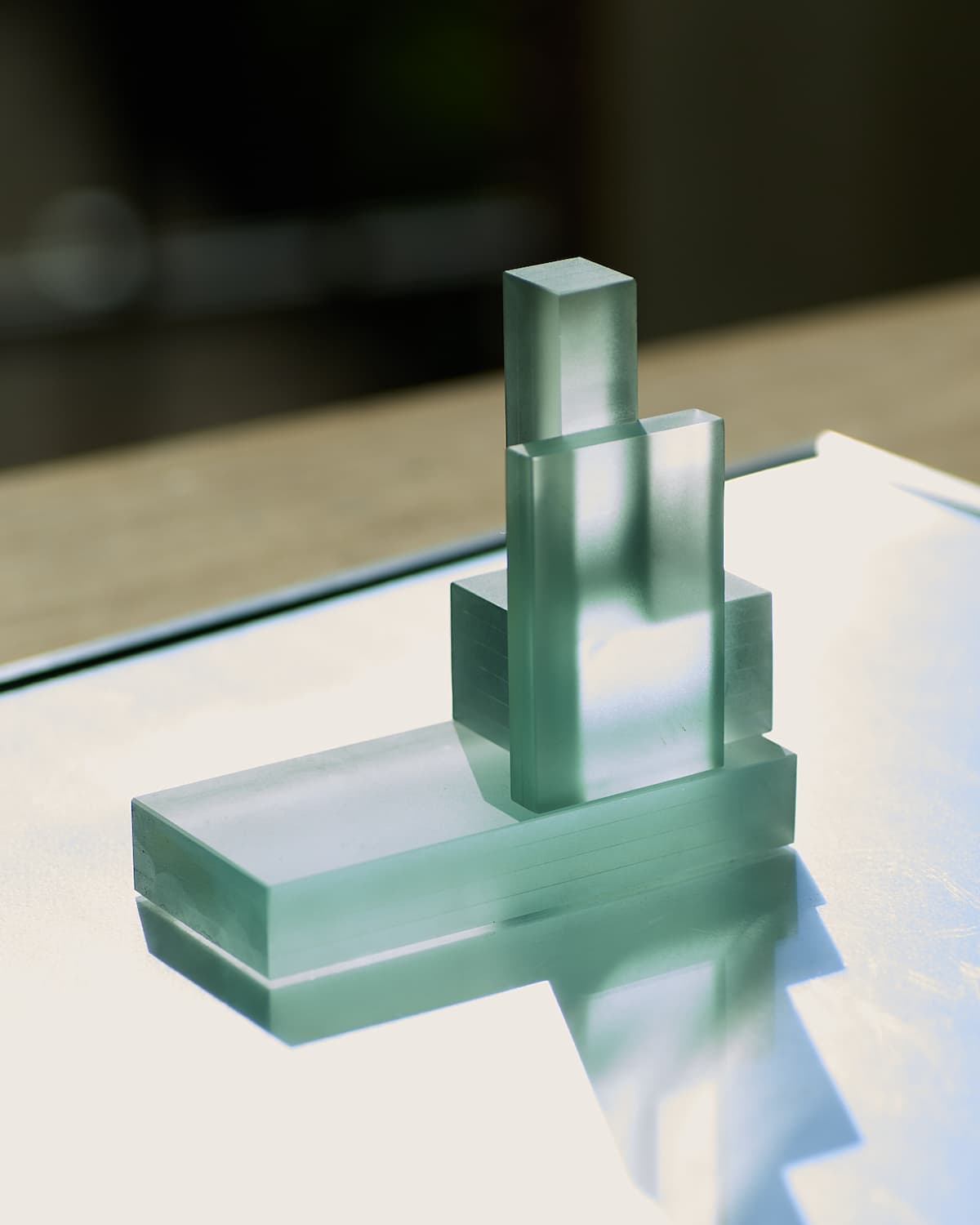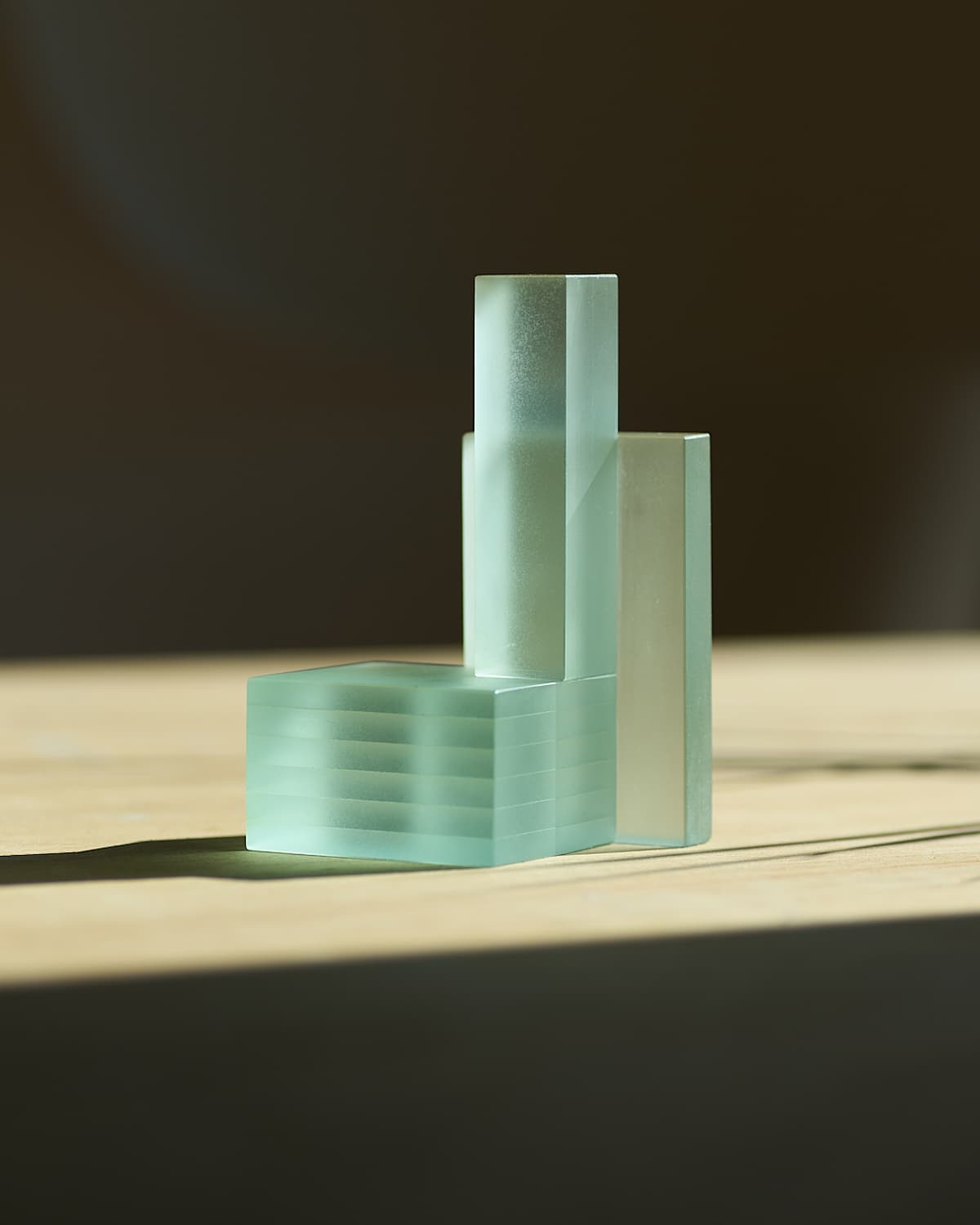WRIGHTオブジェは光にかざすと、淡いラインが幾重にも浮かび上がり、空間に連続するライトブルーの帯からなる静かな層をつくります。また、WRIGHT オブジェは、縦・横・高さ、3通りの置き方ができるように設計しています。向きが変わるたび、空間に伸びゆく影やそのシルエットの変化を楽しめる一点もののオブジェです。