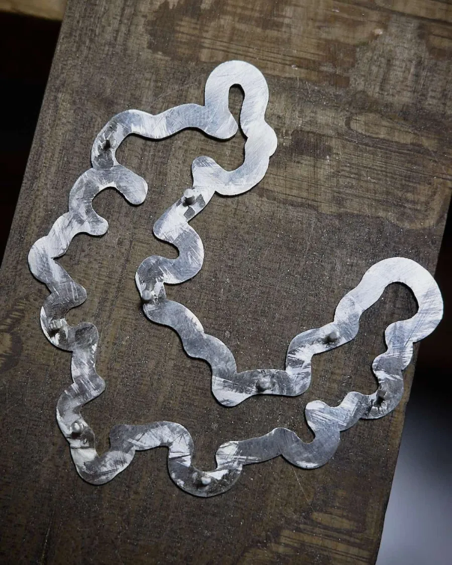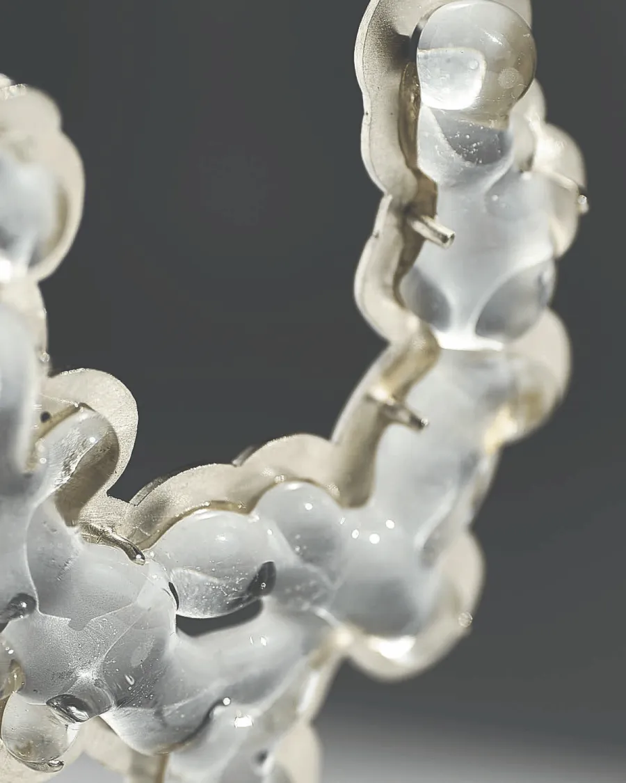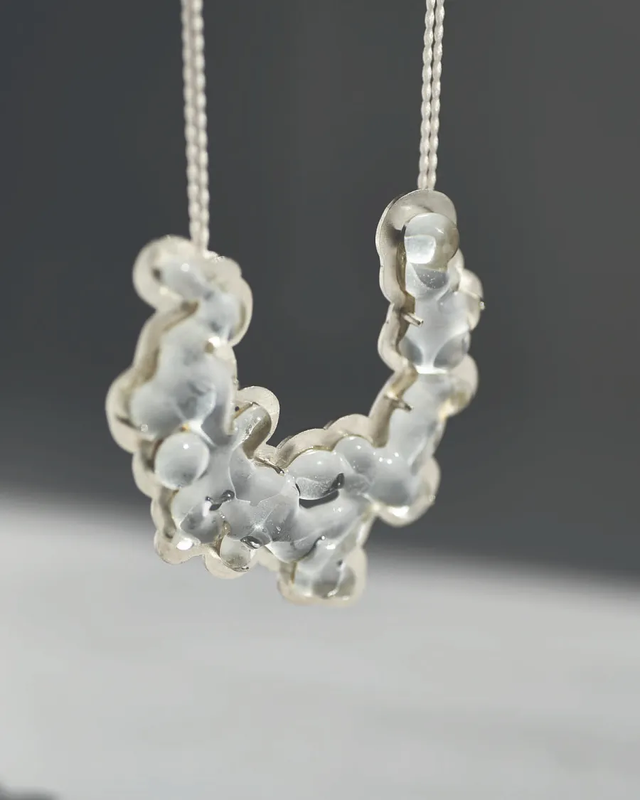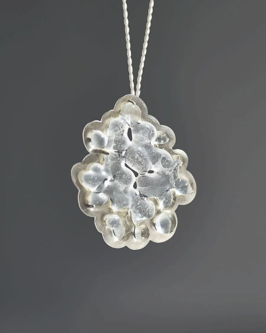 ガラスのモチーフは、シルバーの爪で留めています。点で支えることで輪郭が軽やかに見え、厚みや曲線、層の重なりがそのまま立ち上がります。光が入ると、透明の中の濃淡や小さな泡が現れ、見る角度によって表情が少しずつ変わります。近くで見るほど、静かな奥行きが感じられるペンダントです。