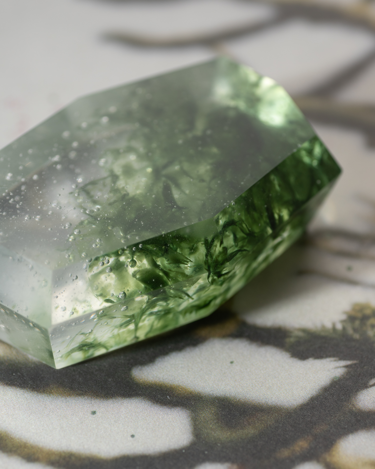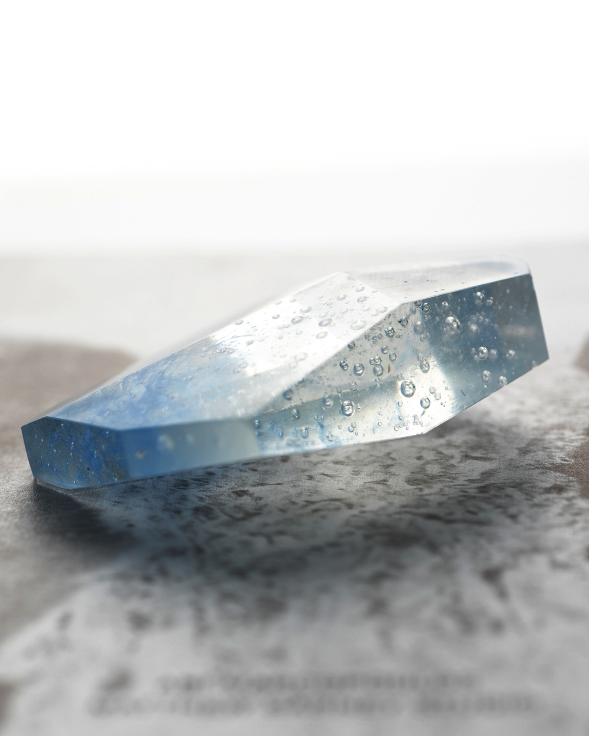 The interplay of fine air bubbles and translucent layers of color creates a quiet depth within,