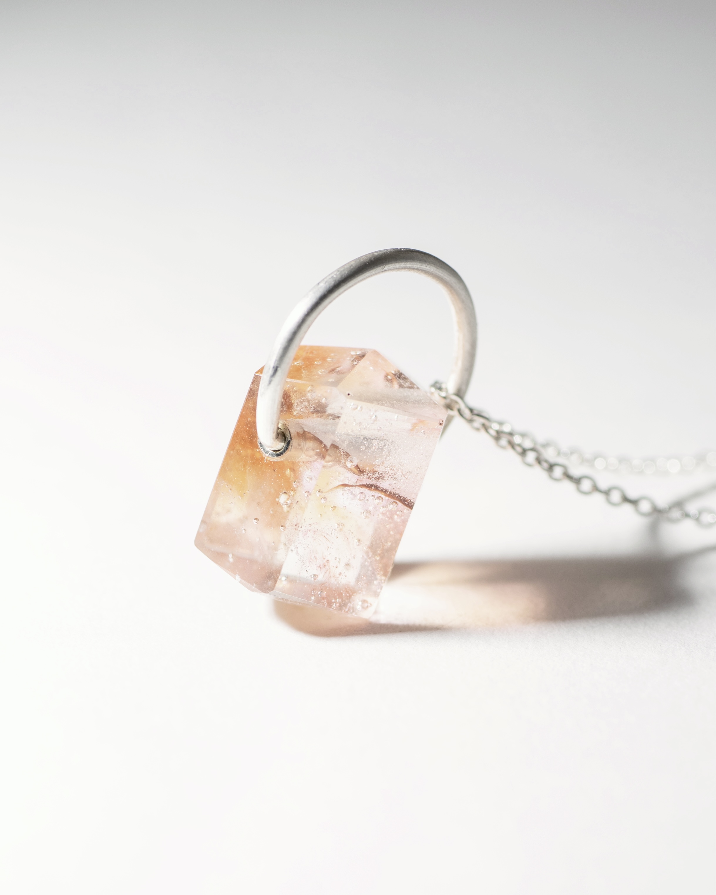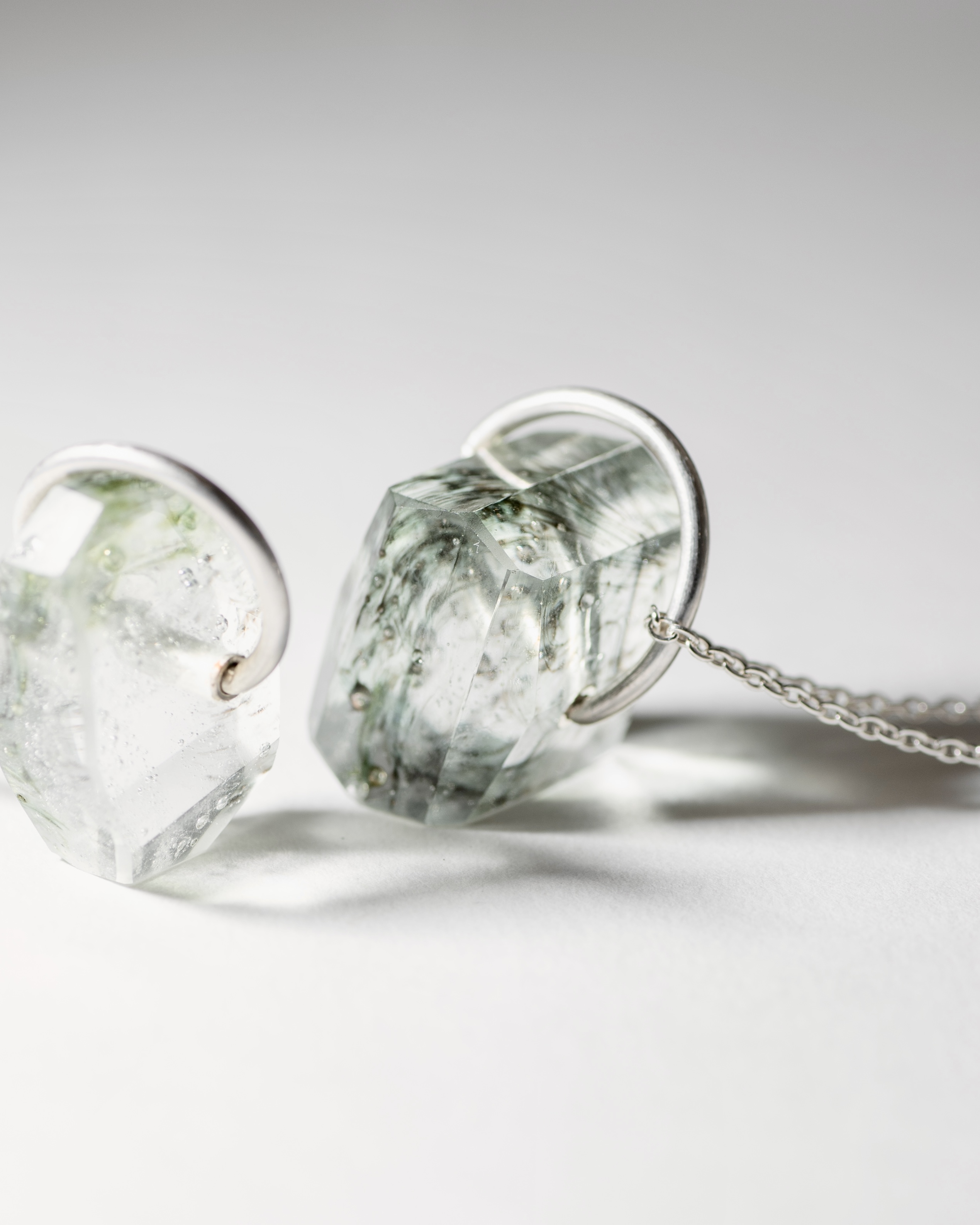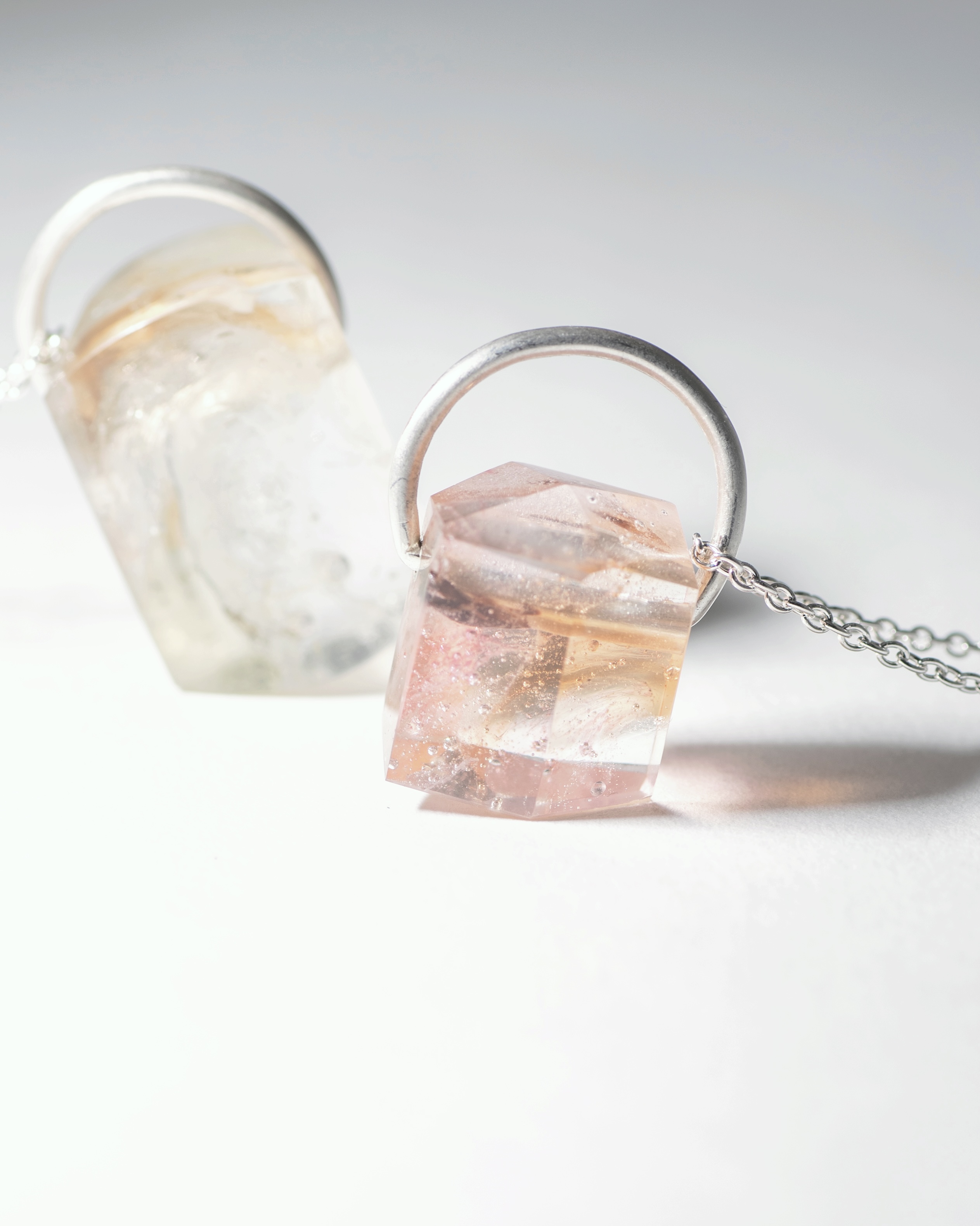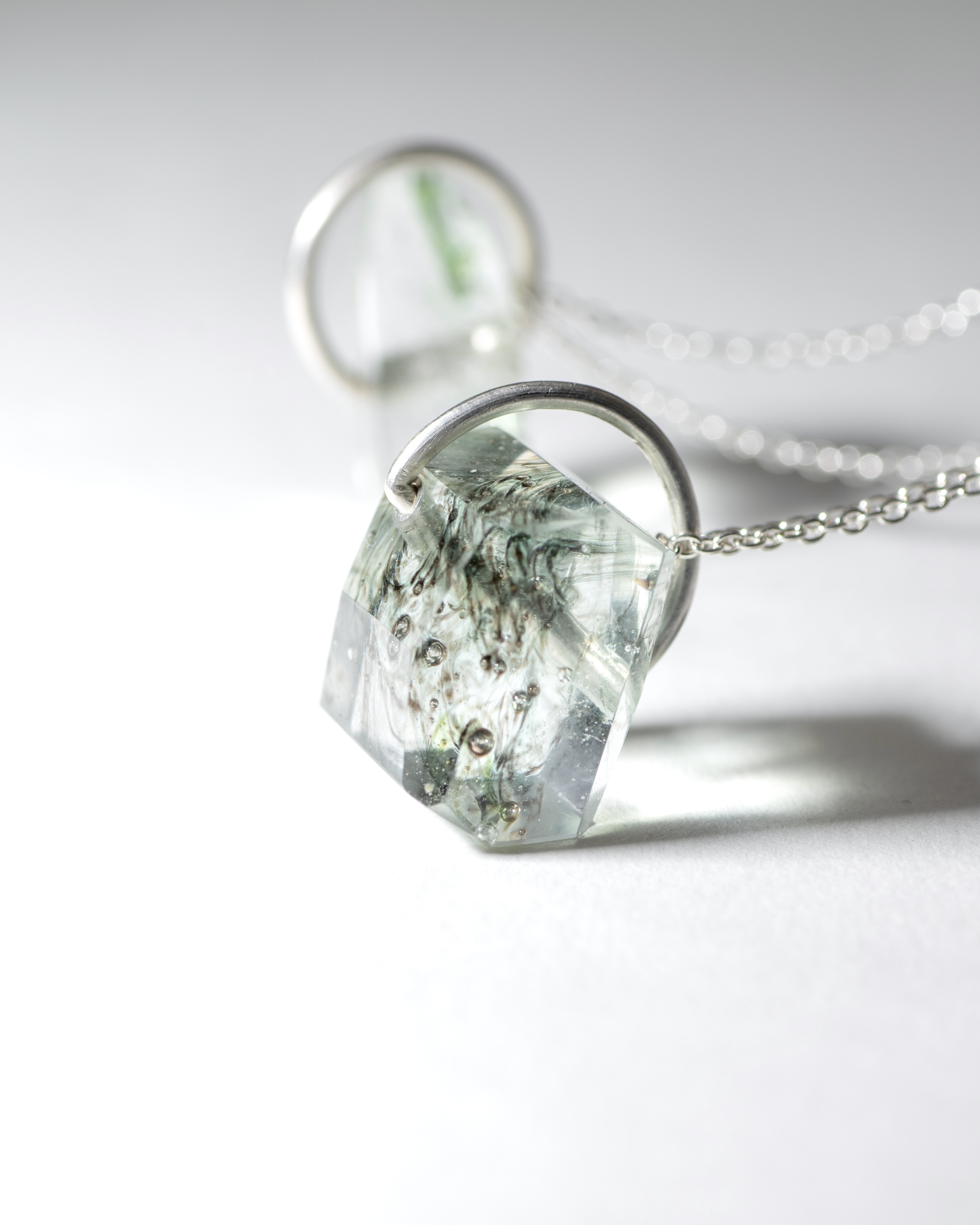 重さを感じさせず、石を持ち上げる――その原理のエッセンスを抽出し、多面体に削り出して研磨したガラスモチーフに、細く仕立てたシルバーのパイプとリングを通した構造。軽やかさと確かな存在感が共存する、静かな佇まいのペンダントです。
