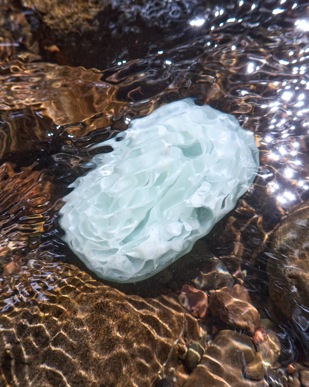 INWATER collection was inspired by the discovery of similarities between glass and soap, both transformed by chance across distant times and places. Featuring a unique light blue texture reminiscent of frothy bubbles, it captures the phenomenon of devitrification—a process in which glass loses its transparency.