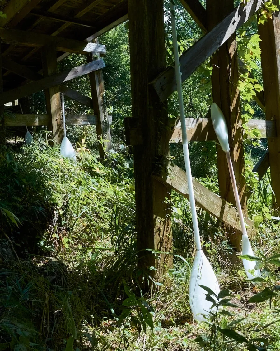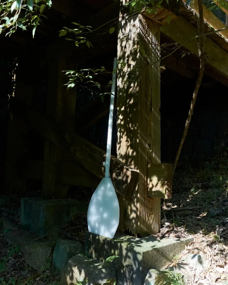 草木が生い茂る沢に、舟を漕ぐ道具であるパドルのかたちになぞらえた立体を配置したこの作品は、それぞれが自由に、自分のリズムで新たな航路を漕ぎ出すことへの思索をコンセプトにしています。 わたしたちが長い間関心をもっているガラスとは異なる質感やスケールを持ちながらも、やわらかく光を包みこみ、ゆっくりと空間に広がっていくような乳白色のワックスを用いて制作しました。この「ROWING BOATS」のコンセプトは、その後、Gleicheniaのさまざまなジュエリー制作の出発点となっています。