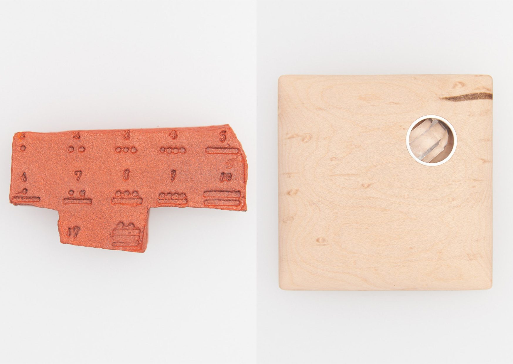 彫刻作品の型取りにおいて、最も重要でありながら目にふれることはないモールドを支持体としたKatagiriの彫刻作品"Concave"シリーズをはじめ、シルエットや痕跡をテーマにしたマルチブロック手法による作品の数々は、物事の機微を捉えることの大切さを想起させます。またGleichenia は、文字を綴ることで生まれた余白から着想を得たピンブローチ”OFFLINE” など木材や水晶、ガラスを用いた表現と技巧で、普段ならば省略されてしまう事象やディテールに焦点をあてたジュエリー作品を発表します。