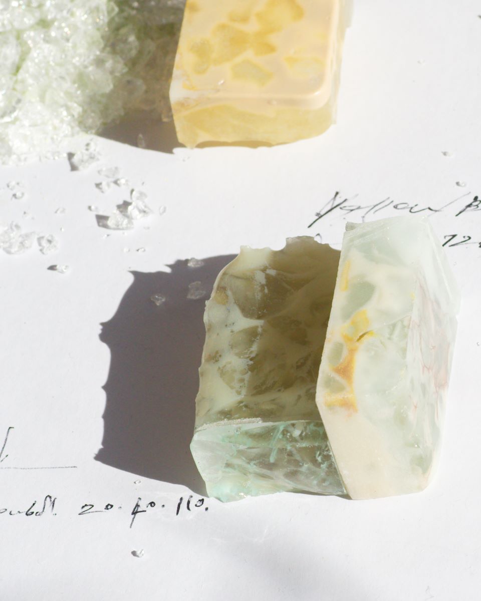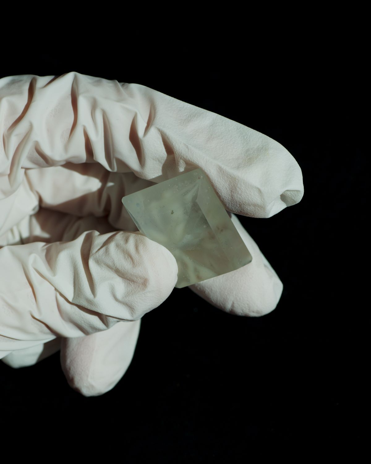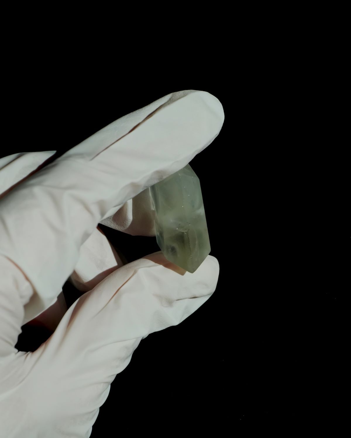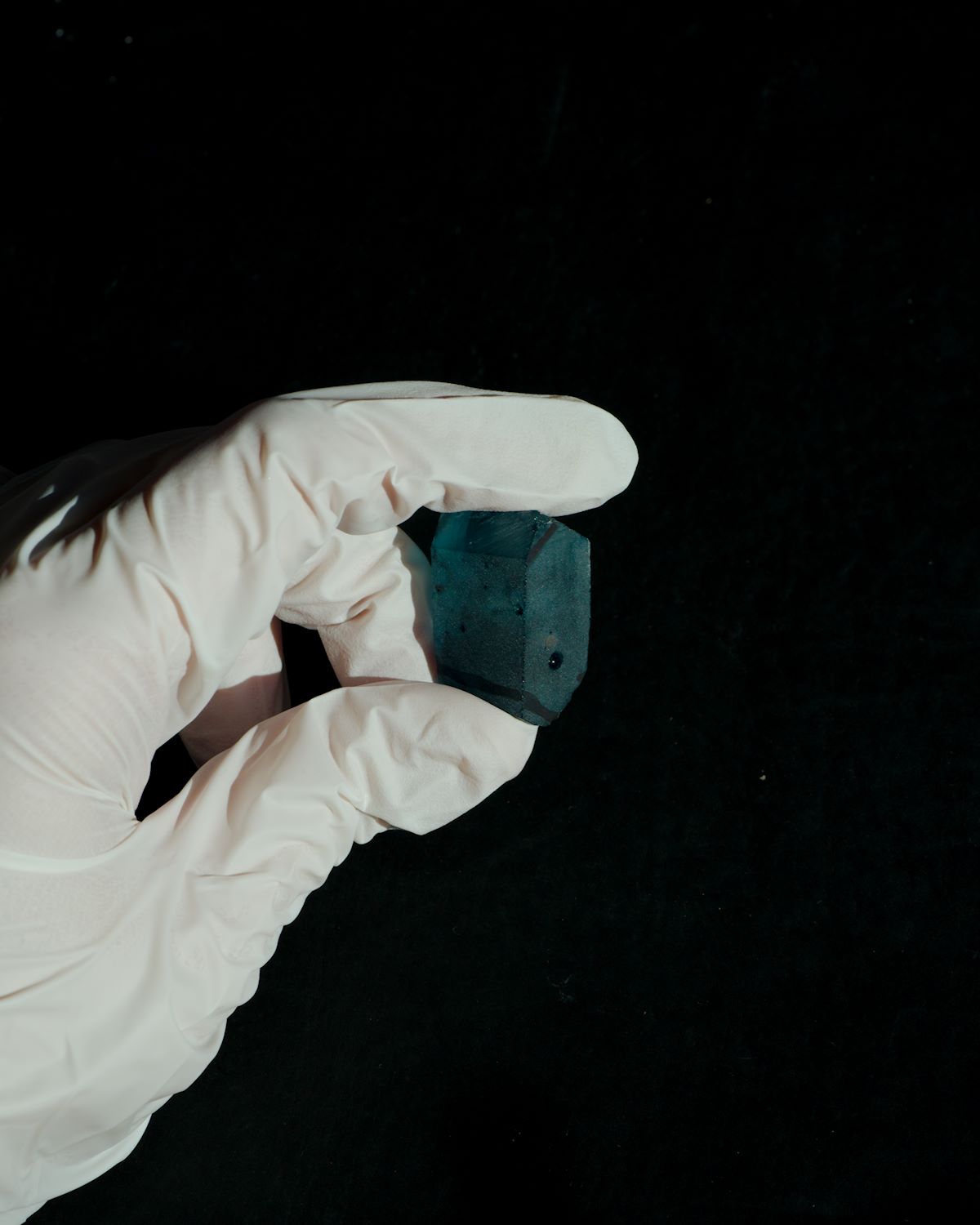 The polyhedral glass motifs of the CAIRN pendant are crafted entirely by hand—from color blending and melting to carving and polishing.As each piece is carefully polished, its once-muted surface begins to shine, revealing unexpected textures that surprise and captivate with every detail.