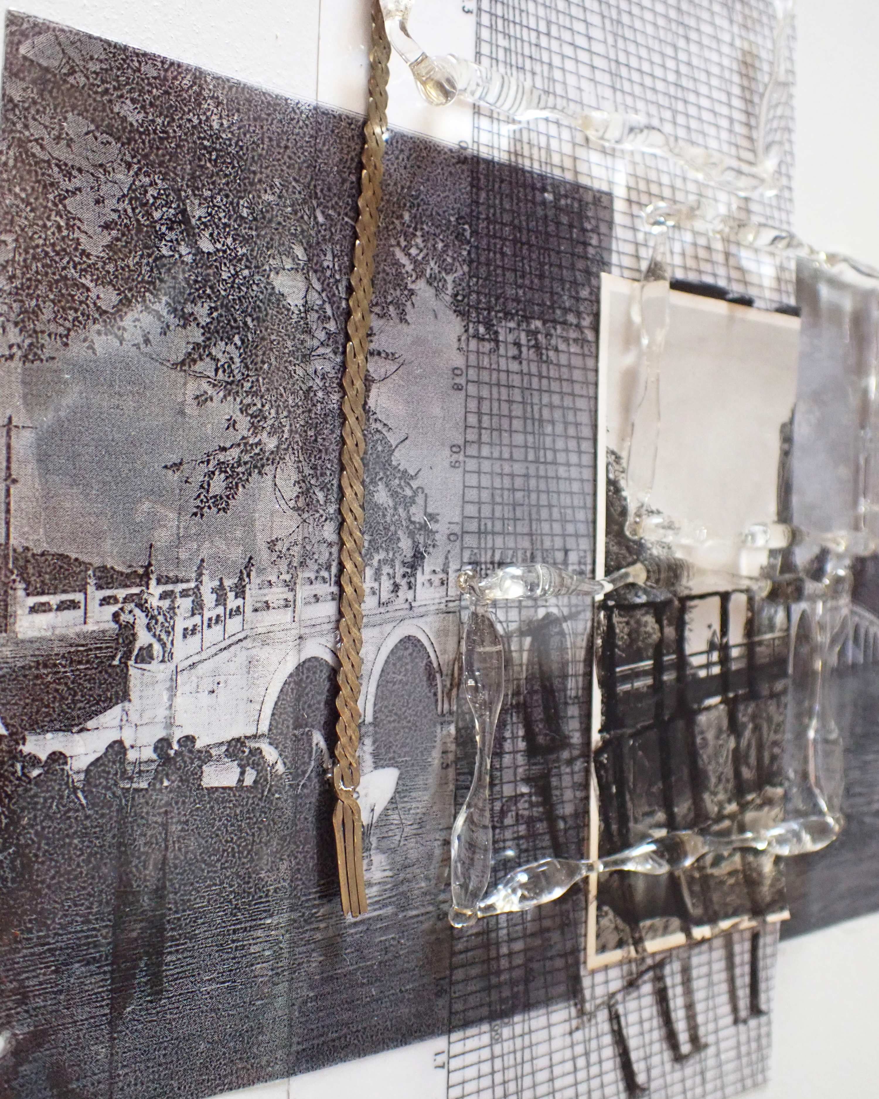 This collage series was inspired by the ancient Roman aqueduct Pont du Gard, made of around 40,000 stones. I reflected on the traces of water that once flowed through it, focusing on its techniques and ingenuity. The triple arches, carved Roman numerals, and management of water pressure caught my attention. Using materials like glass, metal, and resin, I explored themes of "water mirror," "gradient," and "bridge annotation," creating a new expression of water's timeless flow.