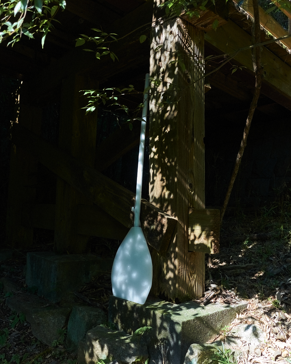 An installation presented at the start of our brand. This piece, set in a lush ravine, features three-dimensional objects resembling paddles. The concept behind the work reflects a contemplation of freely embarking on new journeys, each moving at its own rhythm.Although the material and scale differ from glass, a material we have been deeply interested in for a long time, the piece was created using milky-white wax, which softly envelops light and slowly expands into the space. The concept of ROWING BOATS later became the starting point for the creation of various Gleichenia jewelry pieces.