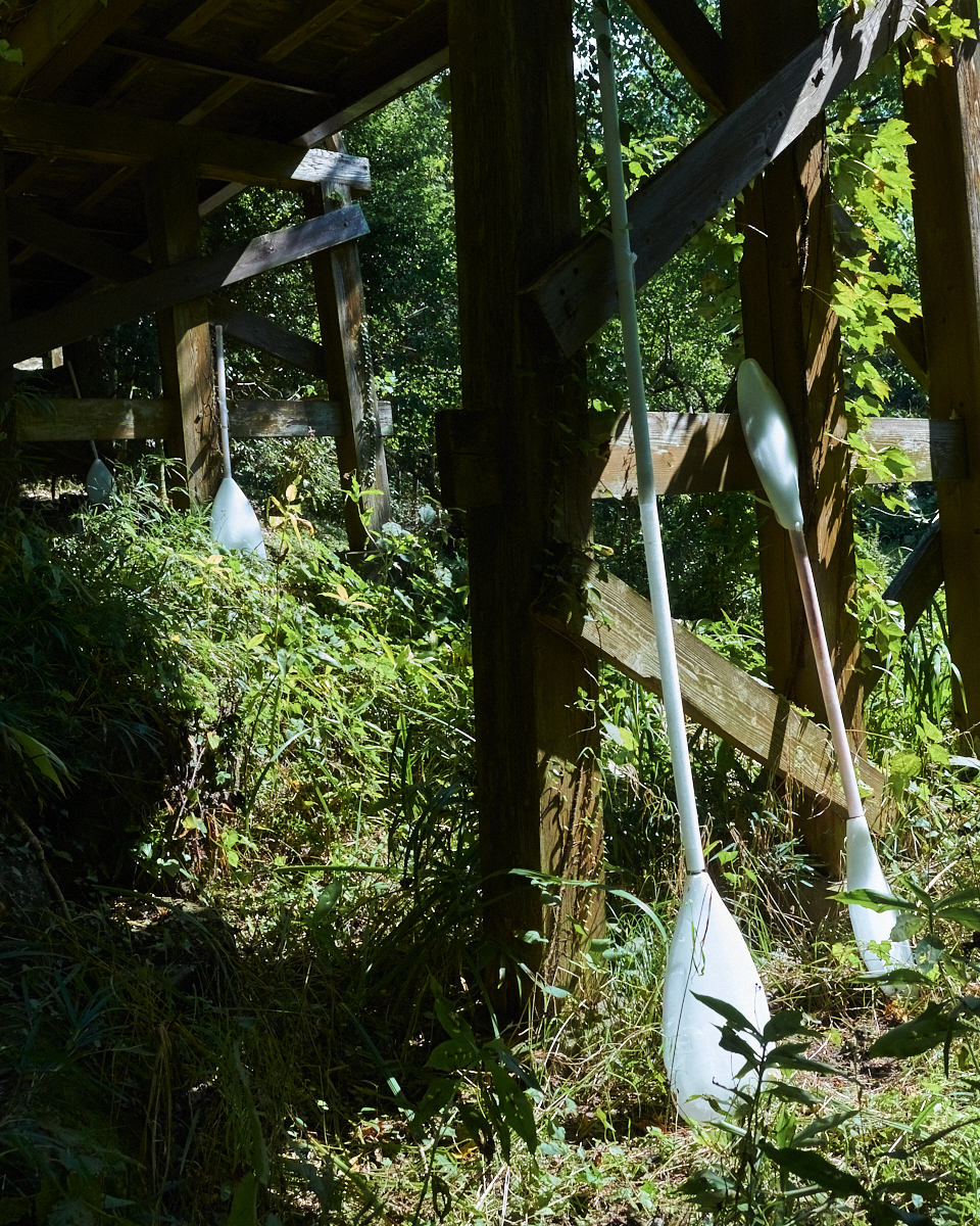 ブランドをスタートした当初に発表したインスタレーション。草木が生い茂る沢に、舟を漕ぐ道具であるパドルのかたちになぞらえた立体を配置したこの作品は、それぞれが自由に、自分のリズムで新たな航路を漕ぎ出すことへの思索をコンセプトにしています。 わたしたちが長い間関心をもっているガラスとは異なる質感やスケールを持ちながらも、やわらかく光を包みこみ、ゆっくりと空間に広がっていくような乳白色のワックスを用いて制作しました。この「ROWING BOATS」のコンセプトは、その後、Gleicheniaのさまざまなジュエリー制作の出発点となっています。